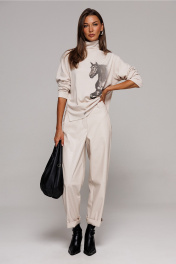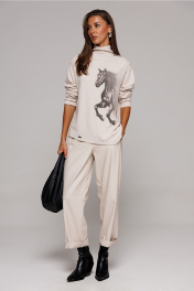 Джемпер из трикотажного полотна с велюровым эффектом прямого силуэта со спущенной линией плеча. Рукав втачной. По переду печать "Лошадь" и нашивка с гравировкой "BUTER". Низ джемпера по переду фигурный ассиметричный. Внизу по правому боковому шву обработан разрез. Воротник-стойка цельнокроеный.