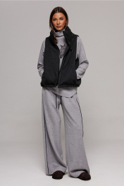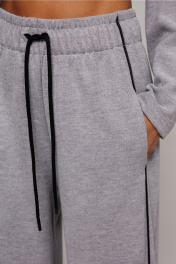 Брюки из трикотажного полотна с велюровым эффектом прямого силуэта на цельнокроеном отстроченном поясе со вставленной в него резинкой и декоративным шнурком. По бокам отрезной бочок с кантом и карманом в шве притачивания бочка.