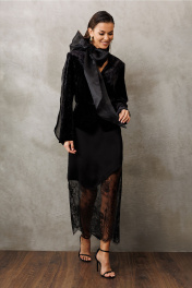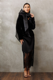 Юбка прямого силуэта из атласа и кружева. Юбка на обтачке. По переднему и заднему полотнищам юбки - вытачки. Юбка с застежкой в боковом шве на потайную тесьму-молнию. Верхняя часть юбки из атласа с асимметричный краем, нижняя часть юбки из кружева с ажурным низом. Юбка без подкладки.