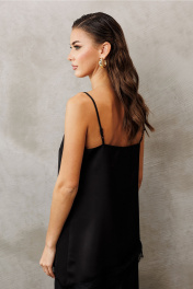 Атласная блузка-топ с кружевом на регулируемых бретелях и асимметричным низом, прямого силуэта, на широкой обтачке. Полочка с V-образным вырезом и кружевом по вырезу и нагрудной вытачкой. По низу блузки кружево.