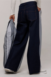 Брюки-палаццо, комбинированные из костюмной ткани по переду и джинса по спинке. Брюки на притачном поясе со шлевками и застежкой-гульфик. Пояс застегивается на петлю-пуговицу. По переду со складками и заутюженной стрелкой от одной из складок по всей длине брюк и карманами в боковых швах с наклонным входом. По спинке кокетка, накладные карманы и заутюженная стрелка.