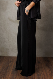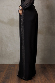 Брюки-палаццо из костюмной ткани с лампасом из пайеток. Брюки на притачном поясе и застежкой-гульфик. Пояс застегивается на петлю-пуговицу. По переду карман в шве притачивания к лампасу. По спинке пояс на резинке и вытачка от пояса.