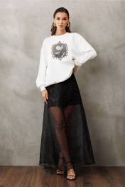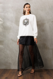 Юбка А-образного силуэта, длинная с застежкой на потайную тесьму-молнию в боковом шве. Верхняя юбка из органзы со стразами, нижняя короткая юбка из костюмной ткани. Верх юбки на обтачке.