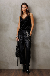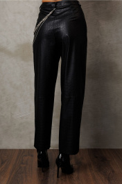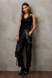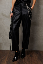 Брюки их эко-кожи заужены к низу. На притачном поясе со шлёвками, застежкой-гульфик. Пояс застегивается на петлю-пуговицу. По переду рельефы и карманами в них. По спинке вытачка от пояса. По переду и спинке брюки отрезные по лини колен.
