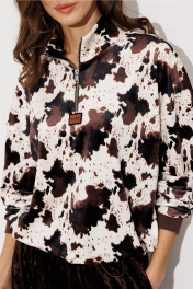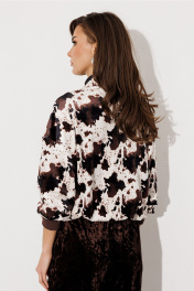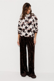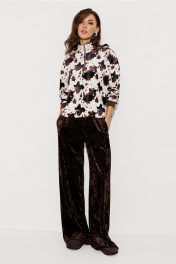 Костюм велюровый 2-ух предметный. Джемпер из принтованного велюра прямого силуэта с втачным рукавом и спущенной линией плеча, с манжетой из довяза по низу рукава. По переду молния и нашивка "BUTER". Воротник-стойка. По низу подгибка со вставленной в него эластичной тесьмой и фиксатором, благодаря которому низ можно затянуть. Брюки из однотонного велюра на цельнокроеном отстроченным поясе со вставленной в него резинкой. Брюки прямого силуэта с карманами в боковых швах.
