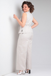 "Летний льняной костюм от Celentano, состоящий из жилета и брюк. Застежка двубортная на петли и пуговицы. Полочка с рельефами. Спинка с центральным швом и талиевыми вытачками. Низ жилета фигурный. В комплект идет пояс из основной ткани. Длина изделия 58 см. Брюки палаццо. Пояс притачной, застежка на петлю и пуговицу и гульфик с молнией. По задним половинкам брюк обработана кокетка. По бокам функциональные карманы. Длина изделия с учётом пояса по боковому шву 107 см. Длина изделия по шаговому шву 76 см. Рост модели 173 см. Костюм выполнен из качественного белорусского льняного полотна (пр-во Орша). Ткань не тянется. Все пуговицы натуральные кокосовые. Наш костюм из натурального льна будет комфортен для повседневного использования теплой весной и летом. Брюки и жилет можно приобрести раздельно. Модели 5033 и 5037 соответственно."