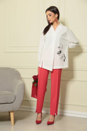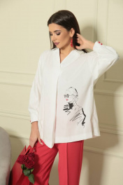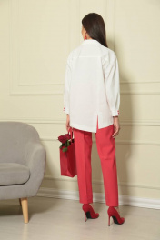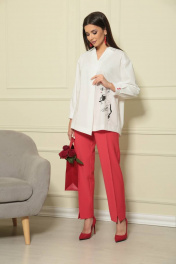 Яркий, невероятно женственный весенний брючный комплект выполнен в классическом сочетании белого, красного и штрихами чёрного цветов, что позволяет легко создавать неповторимые образы, подбирая аксессуары . Стильная , свободная и комфортная рубашка ""Милания"" из хлопка высокого качества с модным графичным принтом ""Леди""подчеркнёт индивидуальность её владелицы. Силуэт рубашки свободный, по переду расположена декоративная планка с мягкой складкой. Воротник рубашечного типа , на отрезной стойке. Рукав рубашечного покроя, с мягкой линией плеча. Низ рукава с мягкими складками , оформлен манжетой с застёжкой на пуговицы алого цвета. Детали спинки оригинально дополнены разрезами в рельефах и складкой из линии кокетки. Длина рубашки по среднему шву спинки 75см, длина по переду от плечевого шва 73 см,длина рукава 57 см. Брюки из приятной костюмной ткани цвета алой розы. Посадка брюк высокая, на поясе по линии талии, без карманов. По передней части брюк расположена стрелка с отстрочкой, подчёркивающая стройность ног. Нижняя часть переда брюк украшена трендовым в этом сезоне разрезом. Силуэт брюк прямой, по спинке заутюжена стрелка. в 52, 54 и 56 размерах по спинке пояс с эластичной резинкой, позволяющей регулировать прилегание по талии. Длина брюк 96 см, ширина внизу 19 см.