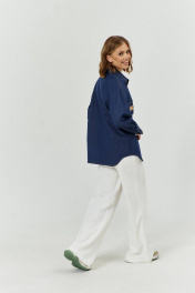 Рубашка женская прямого силуэта с застежкой с планками на 7 прорезных петель и пуговиц. Рубашка выполнена из джинсовой ткани. Перед с нагрудными вытачками. На правой полочке- отлетная кокетка с настроченной листочкой с пуговицами и нашивка. Правая полочка с накладным карманом. Спинка без конструктивных элементов.Низ изделия фигурный. Рукава втачные, одношовные, длинные с притачной по низу манжетой, застегивающейся на 2 прорезные петли и пуговицы. По шву притачивания манжеты обработан разрез и 2 складки. Воротник рубашечного типа с отрезной стойкой, застегивающейся на 1 прорезную петлю и пуговицу; и с отрезной деталью, посередине отлетной части воротника