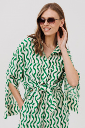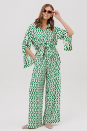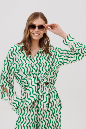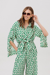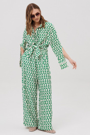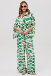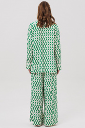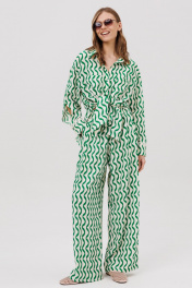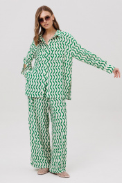Комплект женский, состоящий из рубашки и брюк. Рубашка женская прямого силуэта с центральной застежкой с планками, застегивающимися на 8 прорезных петель и пуговиц. Перед - с накладными карманами. Спинка без конструктивных элементов. По бокам – высокие разрезы. Рукава рубашечного типа с притачными по низу манжетами, застегивающимися на 3 прорезных петли и пуговицы. По шву притачивания манжеты настрочено кружево. Посередине рукава обработан высокий разрез. Воротник рубашечного типа с отрезной стойкой, застегивающийся на 1 прорезную петлю и пуговицу. Брюки женские прямого силуэта с притачным поясом на резинке. По поясу проложены 2 строчки, закрепляющие резинку. Передние половинки с боковыми карманами. Задние половинки без конструктивных элементов.