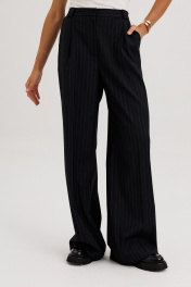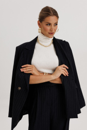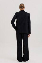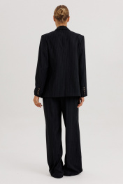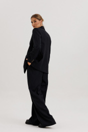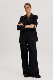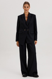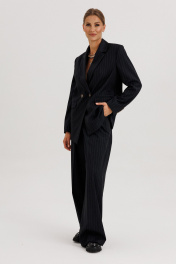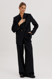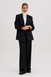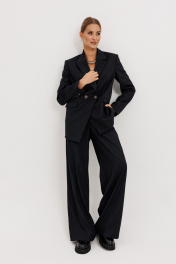 Костюм женский, состоящий из жакета и брюк. Жакет прямого силуэта с двубортной застежкой на 2 петли и пуговицы. Полочки - с прорезными карманами с клапаном и 2-мя обтачками, с нагрудными вытачками от кармана вверх. Низ переда асимметричный. Правая полочка удлинена к борту. Спинка со средним швом и рельефами от низа до проймы. Воротник пиджачного типа с отложными лацканами. Рукава длинные втачные 2-хшовные, с передним и локтевым швами. В нижней части локтевого шва обработана закрытая шлица с 4-мя пуговицами. Жакет на подкладке и с плечевыми накладками. Брюки - палаццо с застежкой с гульфиком и откоском на тесьму-молнию; с притачным поясом с резинкой по спинке. Пояс со шлевками (2 широкие -по переду и 3 узких по спинке). Пояс застегивается на потайной крючок. Передние половинки брюк со складками и боковыми карманами. Задние половинки брюк с талиевыми вытачками.