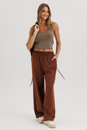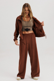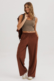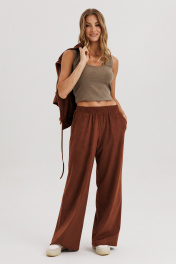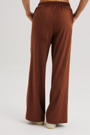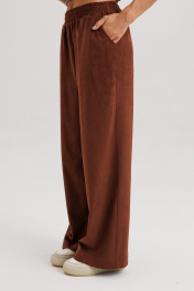 Брюки-палаццо с притачным поясом с резинкой. По поясу проложены 2 параллельных строчки. Брюки выполнены из искусственной замши. На передних половинках брюк обработаны боковые карманы. Задние половинки брюк без конструктивных особенностей.
