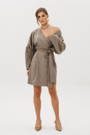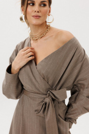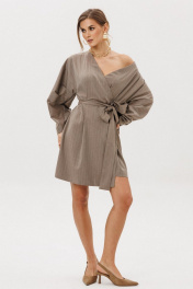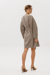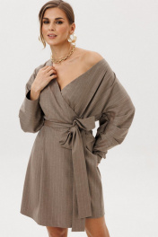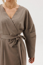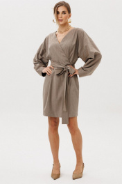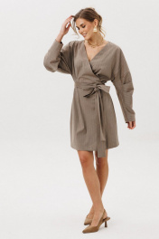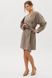 Платье - женское, прилегающего силуэта, “на запах”, застегивающееся на 2 петли и пуговицы. Перед - отрезной по линии талии, со складками. Спинка со складками. Рукава отрезные на основе цельнокроеного рукава, с 3-мя складками от нижнего шва. Вырез горловины-V-образный.