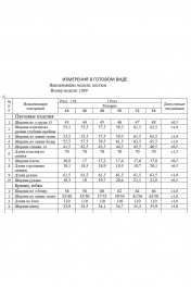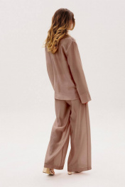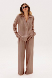 Костюм женский повседневный, состоящий из блузы и брюк. Блуза по переду с нагрудными вытачками, с широкими планками, не распашная. На планках расположена декоративная пуговица. Спинка без конструктивных особенностей. Линия плеча спущена. Рукава втачные, длинные, одношовные, с притачной по низу манжетой. Вырез горловины V-образный. Воротник – стояче-отложной с цельнокроеной стойкой. Брюки прямые широкие с притачным поясом на резинке, с боковыми карманами. Брюки на подкладке.