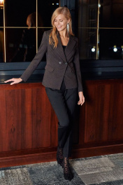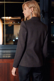 Двубортный жакет длиной 62,0 см, с втачным покроем рукава длиной 60,0 см, с отрезными бочками, карманами с клапанами и листочками по переду. Застежка на 1 декоративную и 1 потайную пуговицы, края борта фигурной формы. Воротник пиджачного типа. Жакет продублирован качественным материалом, на подкладке.