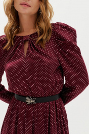 Платье-миди отрезное по талии длиной 113,0 см, с объемными рукавами по окатам длиной 65,0 см. Лиф присборен в виде банта с разрезом в среднем шве. Юбка со складками. Низа рукавов и юбки с рюшами. Спинка со средним швом и застежкой на потайную тесьму-молнию. Съемный пояс в комплекте
