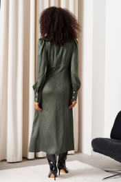 Платье-миди длиной 116 см. Рукав втачной длиной 65 см со сборкой по окату. Покрой - отрезной по линии талии. Низ рукава с манжетой и застежкой на петли и пуговицы. Горловина платья с рюшей со сборкой. Застежка центральная по планке на петли и пуговицы. Застежка в боковом шве на потайную тесьму-молнию. Юбка платья на подкладке.