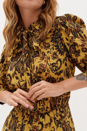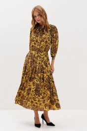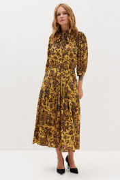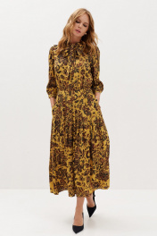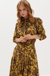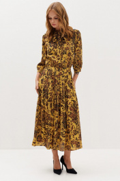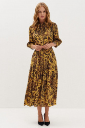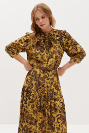 Платье-миди длиной 121 см. Рукав втачной длиной 46 см со сборкой по окату. Покрой - отрезной по линии талии, юбка с застроченными складками. Низ рукава с манжетой и застежкой на петлю и пуговицу. Воротник-стойка с завязками и отложным воротничком со складками. Застежка центральная по планке на петли и пуговицы. Застежка в боковом шве на потайную тесьму-молнию. Платье без подкладки.