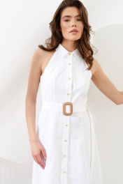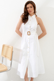 Льняное платье, отрезное по линии талии длиной 120 см. Перед с центральной застежкой по планке на петли/пуговицы. Воротник со стойкой. Платье на подкладке. Съемный пояс с пряжкой в комплекте.