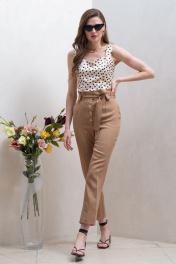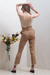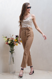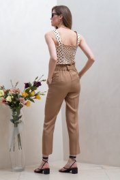 Брюки прямые укороченные цвета виски, на притачном поясе, с застежкой гульфик на четыре петли и пуговицы. Передние половинки брюк с боковыми карманами. Пояс с притачной планкой со складками по верхнему срезу и на резинке сзади. Брюки со шлевками, через которые Общая длина брюк 97 см. Рост модели – 170 см Размер брюк на модели – 44