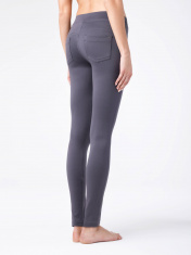 Леггинсы женские облегающие из трикотажного полотна "джинс". По переду изделия - имитация гульфика и боковых карманов. По спинке - фигурные кокетки и накладные карманы. Верх изделия обработан поясом с широкой резинкой внутри. По концам накладных карманов и кокеткам переда на участке боковых швов установлены хольнитены. По боковым швам, швам притачивания кокеток передних и задних половинок, среднему шву передних половинок, имитации застежки-гульфика, шву сидения задних половинок выполнены двойные отделочные строчки.