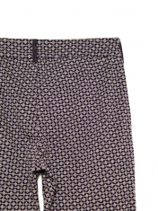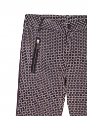 Леггинсы женские жаккардовые облегающие из трикотажного полотна с боковыми швами. По переду изделия - имитация 2-х прорезных карманов "в рамку" с молниями. По боковым швам настрочены отделочные кожаные канты. Гульфик застегивается на застежку-молнию. Верх изделия обработан притачным поясом со шлевками из отделочного кожаного полотна, который застегивается на одну петлю и пуговицу.