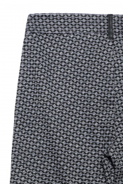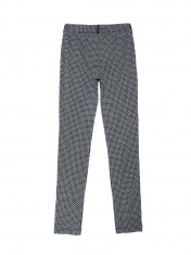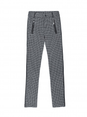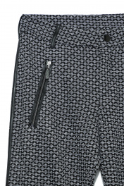 Леггинсы женские жаккардовые облегающие из трикотажного полотна с боковыми швами. По переду изделия - имитация 2-х прорезных карманов "в рамку" с молниями. По боковым швам настрочены отделочные кожаные канты. Гульфик застегивается на застежку-молнию. Верх изделия обработан притачным поясом со шлевками из отделочного кожаного полотна, который застегивается на одну петлю и пуговицу.