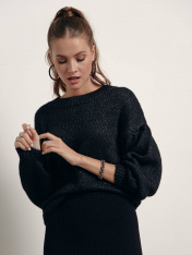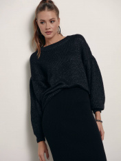 Фактурный oversize-джемпер из пряжи с легким мерцающим блеском поможет создать множество новых образов, не изменяя собственному стилю. Модель отлично сочетается с денимом, брюками и юбками. · круглый вырез горловины· заниженная линия плеч· длинные объемные рукава с манжетами· oversize· классическая длина· фактурное переплетение· объемная, слегка пушистая меланжевая пряжа · легкий мерцающий блеск· свободно, тепло и очень стильно.