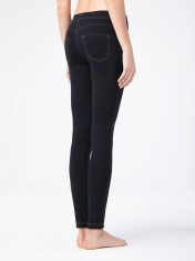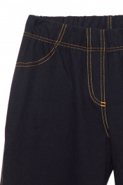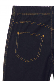 Леггинсы женские из трикотажного полотна "Джинс". По переду имитация застежки - гульфика. Верх изделия обработан широкой резинкой швом в подгибку. По боковым швам, шву сидения задних половинок, среднему шву передних половинок, имитация гульфика выполнены отделочные строчки. Двойные отделочные строчки имитируют боковые карманы по передним половинкам, кокетки и накладные карманы по задним половинкам.