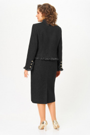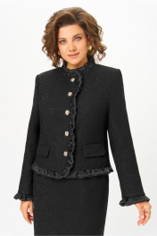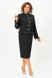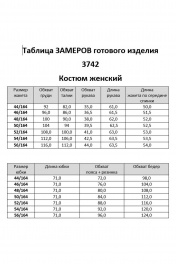 Костюм женский состоящий из двух предметов жакета и юбки на подкладке. Жакет приталенного силуэта, с втачным рукавом и центральной застежкой на пуговицы и петли. По переду жакета расположены клапаны, имитирующие карман. Украшением жакета является оборка из отделочной ткани по горловине, краю борта и низу рукава. По переду и спинке жакета расположены вытачки. Рукав двухшовный, длинный на шлице рукава. По переду и спинке жакета расположены вытачки. Рукав двухшовный, длинный на шлице рукава пришиты декоративные пуговицы. Юбка длинная, прямая, зауженная к низу, со шлицей по спинке. Пояс притачной по боковым швам вставлена эластичная тесьма. В центральном шве спинки застежка молния.