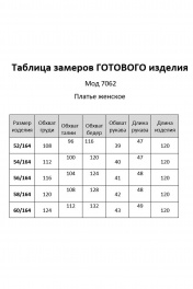 Платье женское прилегающего силуэта, длиной до середины икры, зауженное к низу. По переду: таллиевые и нагрудные вытачки, отделочная отлетная деталь в области талии и бедер, декорированная пряжкой . По спинке: центральный шов с потайной молнией в верху и высокой шлицей внизу, таллиевые выточки вырез горловины в виде «лодочки». Длина 121 см.