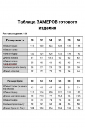 Костюм женский двух предметный, состоящий из жакета и брюк. Жакет прямого силуэта, длиной до линии бедра, без воротника, с центральной застежкой на петли и пуговицы; на подкладке. По переду: вертикальные вытачки и «рабочие» карманы с клапанами в швах. По спинке центральный шов. Рукав вточной, длинный, 2-х шовный, со шлицей в локтевом швеи отделочной пуговицей. Декором изделия служит цветок, выполненный из 2-х тканей, а также контрастный шнур, вставленный в шлевки по горловине жакета. Брюки прямого силуэта, выполнены из отделочной ткани, слегка заужены к низу, с клапанами в боковых швах, притачным поясом и резинкой по задней части, с застежкой-молнией, на петли и пуговицы спереди .