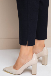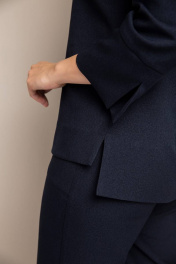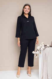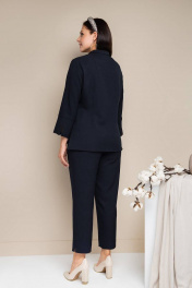 Костюм: жакет и брюки. Жакет полуприлегающего силуэта, с разрезами по бокам и стояче-отложным воротником - апаш, декорированный металлической нашивкой. По спинке - талиевые вытачки. Рукав 3/4, с широкой манжетой и разрезом. Брюки со стрелками и разрезами по бокам, укороченные и зауженные книзу. По переду - карманы с отрезным бочком. Пояс притачной с эластичной тесьмой по спинке. Застежка на тесьму-молнию и пуговицу.