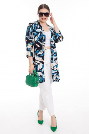 Костюм: туника и джинсы. Туника прямого силуэта с воротником-стойкой. Застежка-планка с пуговицами. На спинке - кокетка. Пройма спущена. Рукав втачной, укороченный, с манжетой. Низ в изделии ассиметричный, спинка удлиненная. Разрезы в боковых швах. Джинсы полуприлегающего силуэта. По переду - карманы с подкройным бочком. На спинке - отрезная кокетка и накладные карманы. Пояс отрезной, с застежкой-молнией. В спинке пояса - резинка.