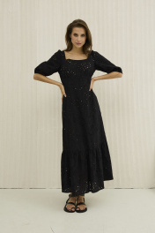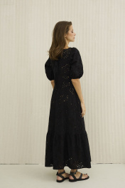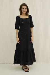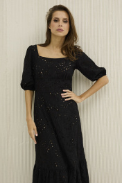 Платье женское приталенного силуэта выполнено из хлопкового ришелье . Платье на подкладке из 100 % хлопка . Вырез горловины "каре", рукав втачной одношовный , со сборкой по окату , низ рукава присборен на эластичную ленту. Внизу платье притачен волан , по спинке завязки из однотона . Застежка в виде потайной молнии в боковом шве .