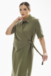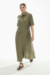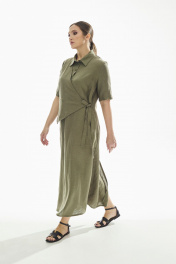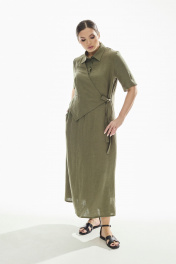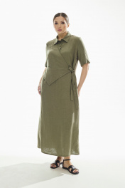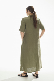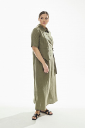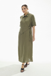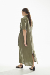Платье женское свободного силуэта выполнено из смесового льна . Рукав втачной одношовный , воротник рубашечного типа , застежка в виде планки на петли и пуговицы . По переду платья отлетная деталь , которая завязыватся сбоку поясом из основной ткани . В боковых швах функциональные карманы , сзади по спинке разрез.