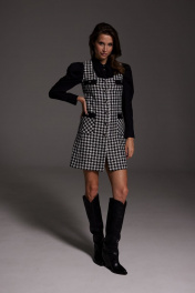 Сарафан женский полуприлегающего силуэта выполнен из ткани в стиле "Шанель " прекрасного качества . Спереди функциональные накладные карманы и отделочные клапаны . Платье - сарафан на шелковичной отлетной подкладке . Застежка центральная на петли и пуговицы .
