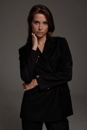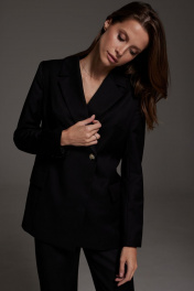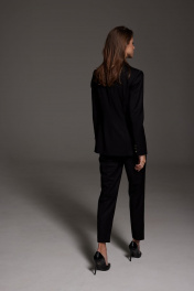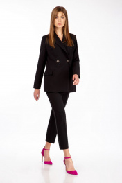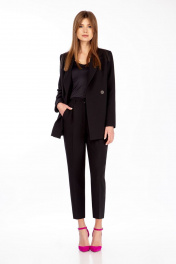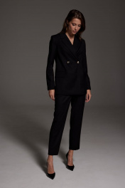 Костюм женский двухпредметный, полуприлегающего силуэта. Выполненный из костюмного однотона высокого качества. Жакет с двубортной застежкой, рукав втачной двухшовный. Воротник стояче - отложной с отворотами лацканов . По переду жакета также функциональные карманы с клапанами. Перед жакета на хлопковой подкладке. Брюки слегка заужены к низу, верх брюк обработан притачным поясом .В верхней части брюк расположены карманы.