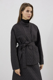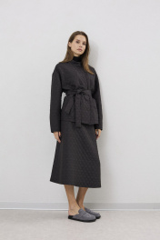 Комплект женский утепленный ,состоящий из жакета и юбки полуприлегающего силуэта , выполненный из фактурной ткани . Жакет с центральной застежкой на пришивных кнопках . Рукав спущенный одношовный. Воротник в виде невысокой стойки . По переду жакета подкладка ,а также функциональные карманы. В комплекте также пояс из основной ткани . Юбка трапецивидной формы на подкладке ,застежка по среднему шву сзади на молнию . Верх юбки обработан покройным поясом .