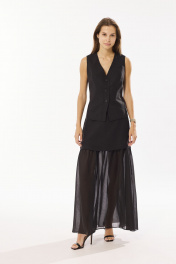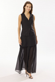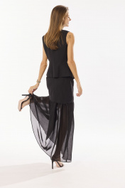 Комплект , состоящий из жилета и юбки . Комплект выполнен из смесового льна и вискозной вуали . Жилет и юбка на хлопковой подкладке , с притачной оборкой из вуали . Застежка в жилете центральная на петли и пуговицы .Верх юбки обработан подкройным поясом - обтачкой , застежка молния в среднем шве .