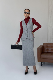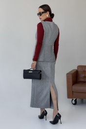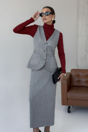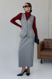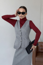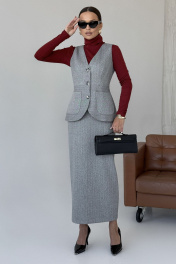 Костюм женский состоящий из жилета и юбки . Костюм выполнен из плательно-костюмной ткани , жилет и юбка на подкладке . Юбка прямого силуэта , верх юбки обработан притачным поясом с резинкой , застежка на молнию , по заднему полотнищу разрез . Жилет полуприлегающего силуэта с центральной застежкой на петли и пуговицы, по талии подрез . По переду жилета накладные карманы .