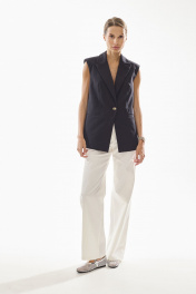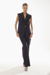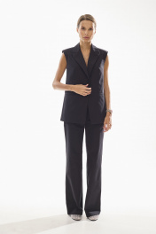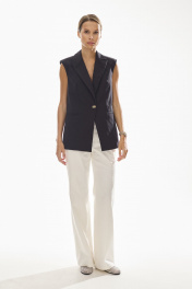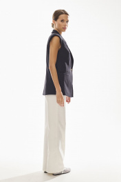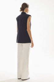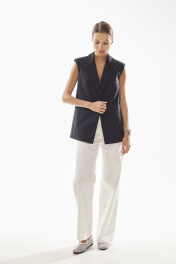Жилет женский полуприлегающего силуэта , выполненный из хлопковой ткани высокого качества . Жилет с центральной застежкой и с четко выраженным плечевым поясом . Воротник стояче - отложной с отворотами лацканов . По переду жилета также функциональные карманы с клапанами . Жилет на хлопковой подкладке.