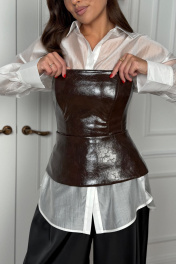 Жилет - бандо , приталенного силуэта , выполнен из искусственной кожи высокого качества . По линии талии подрез , с оригинальной баской . Застежка сзади на разъемную декоративную молнию . Швы данного изделия уплотнены корсетной летной , для четкого силуэта .