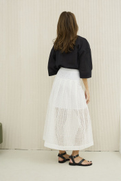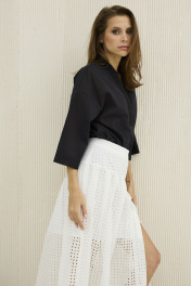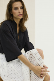 Блуза свободного силуэта со спущенной линией плеча и рукавом длиной 3/4. Вырез блузы и аккуратная стойка офрмлены планками из ришелье , основная ткань тонкий 100% хлопок .