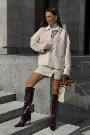Пальто женское , укороченное выполнено из пальтовой ткани хорошего качества . Застежка центральная , потайная на петли и пуговицы . Рукав спущенный , низ рукава обработан притачной манжетой .Воротник стояче -отложной . По переду накладные карманы.