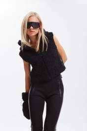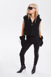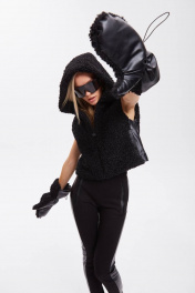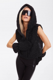 Жилет из трикотажного полотна «каракуль» и экокожи, прямого силуэта, длиной чуть ниже талии, с воротником-стойкой, переходящим в капюшон. Детали переда с застёжкой по центру от низа до верхнего края стойки. По боковым сторонам бочки из экокожи с вертикальными карманами с листочкой в рельефах переда. Жилет на подкладке с утеплителем синтепон. Подкладка капюшона из мягкого трикотажного полотна.