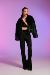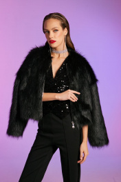 Жилет, комбинированный из трикотажного полотна велюр и велюр с пайетками, полуприлегающего силуэта, длиной чуть ниже линии талии. Детали переда с нагрудными вытачками из линии проймы, с застёжкой на потайные кнопки, с V – образным вырезом горловины, фигурной линией низа. Спинка с рельефами и средним швом, с хлястиками на уровне талии, застёгивающимися на две петли и пуговицы, низ спинки прямой, горловина округлой формы. Жилет на подкладке.