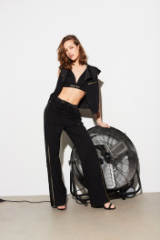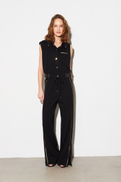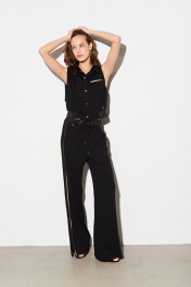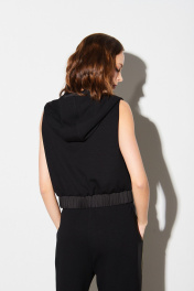 Жилет из трикотажного полотна, прямого силуэта, длиной ниже талии, с воротником-стойкой, переходящим в капюшон. Застёжка центральная на кнопки по краю борта. На левой полочке, на уровне груди расположен нефункциональный карман с листочкой и отделочной тесьмой. Спинка без особенностей. По переднему краю капюшона прострочена отделочная строчка, через люверсы втянут шнур из отделочной ткани. Низ жилета присобран планкой из отделочной ткани с эластичной тесьмой. Внутренние детали капюшона из отделочной ткани. Жилет на подкладке. Брюки с посадкой на талии, прямые от линии бёдер, длиной ниже щиколотки, с широкими лампасами по боковым швам, с вертикальными карманами в швах и шлицами по низу переднего шва. Пояс с эластичной тесьмой, с люверсами и втянутым шнурком. Пояс и лампасы брюк из отделочного полотна. На боковой шов переда настрочена отделочная тесьма.