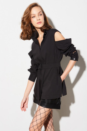 Блузка из ткани платьево-блузочного ассортимента, прямого силуэта, длиной ниже линии бёдер, с рукавами, частично открывающими плечи и воротником-стойкой. Застёжка центральная на декоративную молнию с отлетной планкой от горловины до низа. Стойка с застёжкой на две петли и пуговицы. Низ блузки прямой с высокими разрезами по боковым швам. Рукава со складками по шву притачивания манжет и обтачным верхним краем на уровне середины плеча. Застёжка манжет на две петли и пуговицы. По низу и разрезам прострочена широкая отделочная строчка. На талии расположен съёмный пояс с пряжкой.
