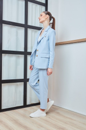 Костюм женский из костюмной ткани, состоящий из жакета и брюк. Жакет полуприлегающего силуэта, длиной ниже линии бёдер, с втачными двухшовными рукавами длиной до запястья, воротником пиджачного типа, с отложными лацканами с острыми концами, с центральной застёжкой на две петли и пуговицы. Детали переда с талиевыми вытачками, переходящими в линию кармана и рельефами от проймы до низа, карманы прорезные функциональные «в рамку» с клапанами со скруглёнными концами. Слева над уровнем груди нефункциональный карман с листочкой и фигурным хлястиком с петлёй и пуговицей. Спинка с рельефами от пройм до низа, со шлицей в среднем шве. По низу локтевых швов функциональные шлицы с застёжкой на две петли и пуговицы. Нижние края бортов скруглённые. Жакет на подкладке. Брюки с посадкой на талии, длиной до щиколотки, полуприлегающего силуэта, заужены к низу. Передние половинки с карманами, наклонными к боковым швам. В среднем шве застёжка на тесьму-молнию, обработана гульфиком и откоском. Задние половинки с двумя парами талиевых вытачек. Пояс-обтачка с застёжкой на петлю и пуговицу, с пятью шлёвками для съёмного пояса. По передним и задним половинкам заутюжены стрелки.