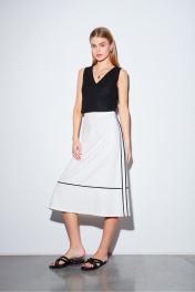 Комплект женский, состоит из жилета и юбки, из двух контрастных цветов мягкой льняной ткани. Жилет длиной до талии. Перед с диагональными нагрудными вытачками из боковых швов и V-образным вырезом горловины. Спинка с застёжкой на потайную молнию в среднем шве и округлой горловиной. Низ прямой. Жилет на хлопковой подкладке. Юбка А-силуэта, с посадкой чуть ниже талии, длиной до середины икры, с горизонтальным подрезом ниже линии колена. Передняя и задняя части со средним швом до линии подреза, задние - с талиевыми вытачками и застёжкой на потайную молнию в среднем шве, переходящую на пояс. В шов подреза входит контрастный кант, боковые швы окантованы контрастной тканью и застрочены на лицевую сторону. Пояс-обтачка с двумя фигурными хлястиками по боковым швам, которые закреплены отделочными пуговицами. Юбка без подкладки.
